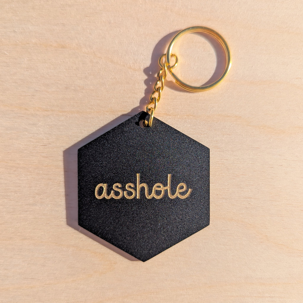 Available as a pair or individually and two different fonts. Made of engraved and painted matte black acrylic with a gold colored keyring.